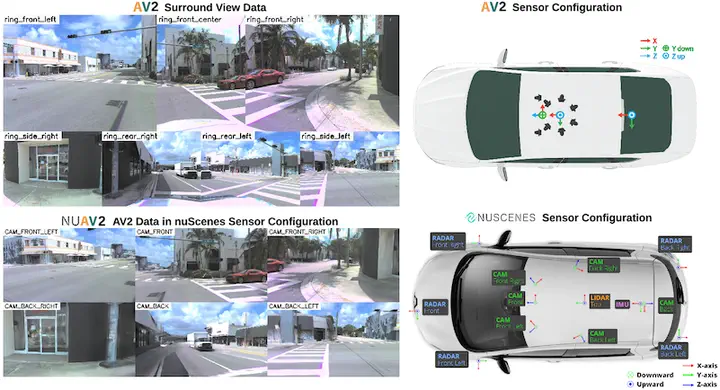 Online mapping algorithms struggle when deployed on a vehicle with different sensor configurations and require labeled data with the same sensor configuration. With the source sensor configuration images collected by Argoverse 2 (AV2) data collection vehicles (top row), we propose to leverage Gaussian splatting to render images in the target nuScenes (NUSC) sensor configuration (bottom row). The synthesized dataset, named nuAV2, is used to train online mapping algorithms to reduce the generalization gap using different training paradigms.